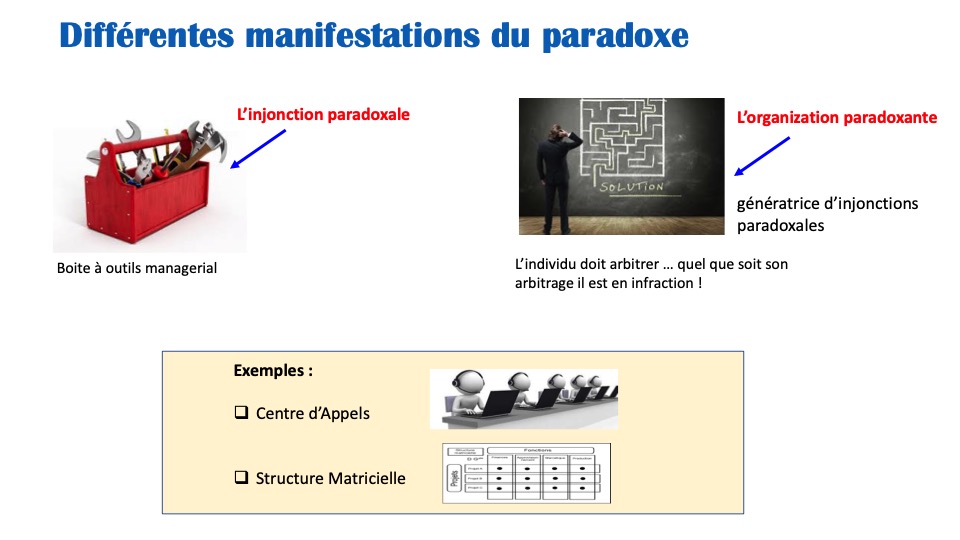 Ces pratiques de « double contrainte », utilisées pour afficher son pouvoir et contrôler autrui, qui existaient souvent dans une relation entre personnes, se sont étendues maintenant à la structure et au fonctionnement même de l’organisation du travail. Dans ces cas, il devient difficile de dépasser le paradoxe par l’identification de ses origines et ses causes, et surtout par l’impossibilité de les discuter collectivement pour en reconstruire un sens. On parlera d’organisations alors qualifiées de « paradoxantes » à cause des effets qu’elles génèrent.